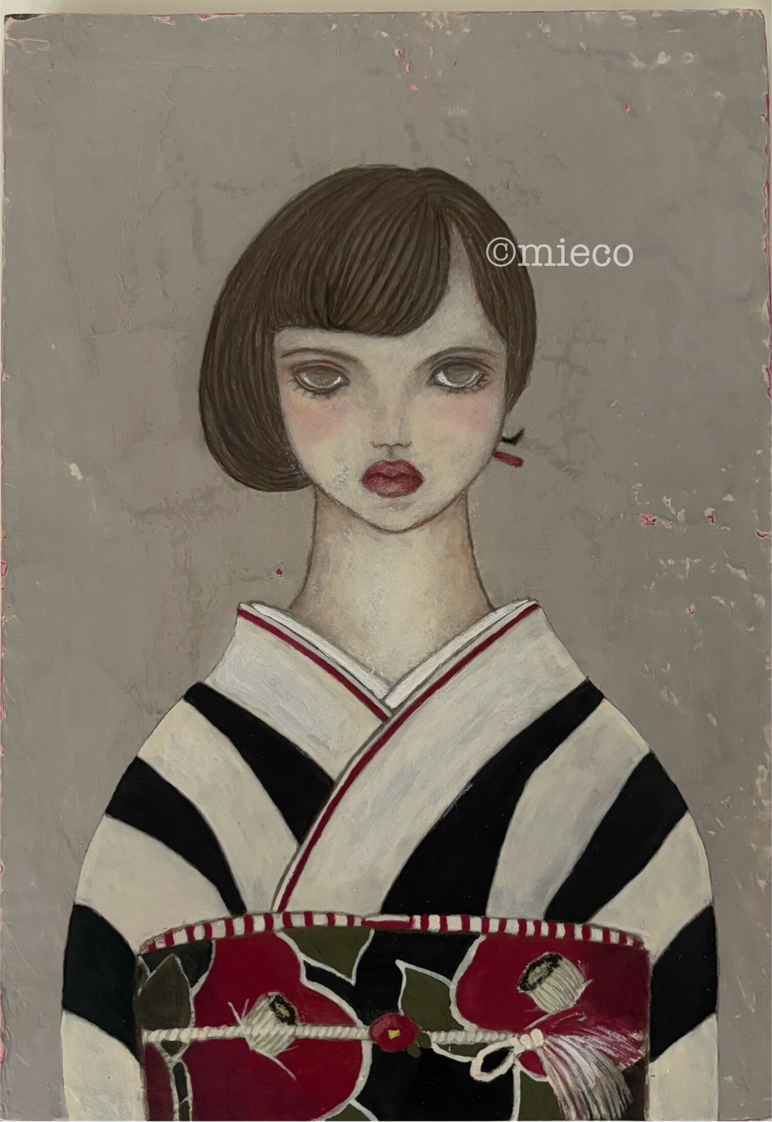 この『控えめな優しさ/誇り〜つばき(赤)』は、花言葉をテーマにしたシリーズの原画作品です。しっとりとした美しさと力強さを併せ持つ椿の花を帯にあしらった目力の強い女性は、あなたの心に強さと温かな感情を呼び起こし、静かな感動を与えてくれることでしょう。