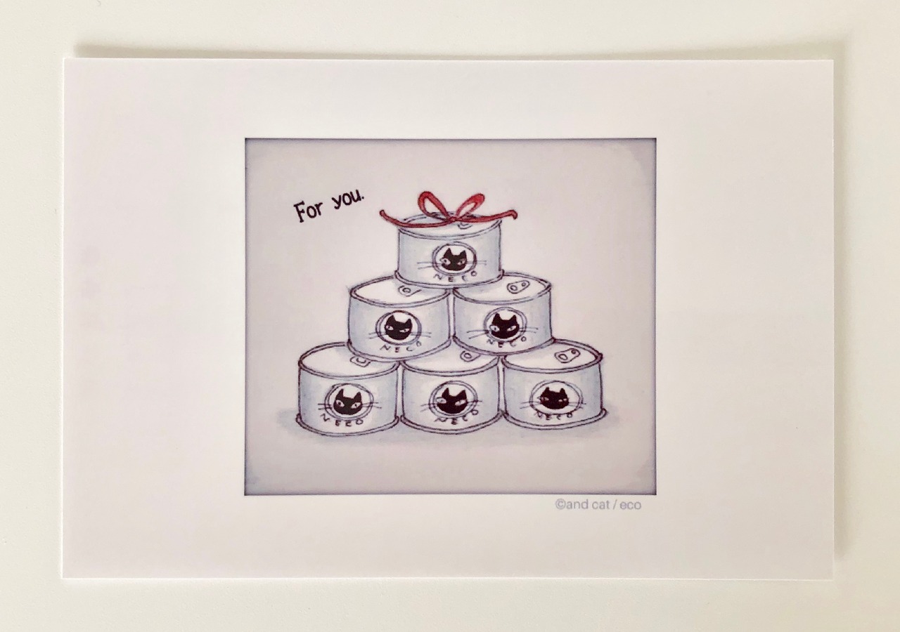 猫さんにとっては夢のような猫缶をピラミッドに積み上げた、猫缶ギフトポストカードです。